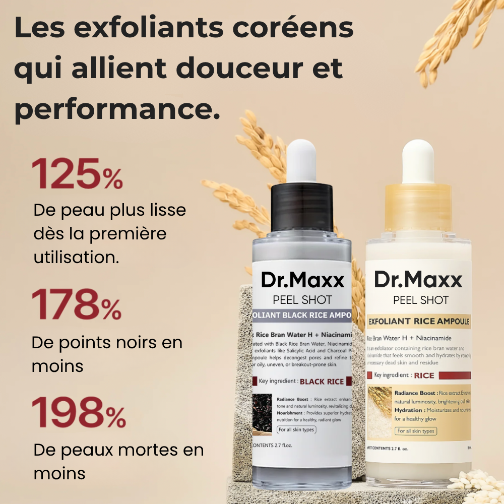 (L’exfoliant au riz noir pour purifier, le riz blanc pour lisser et illuminer.)