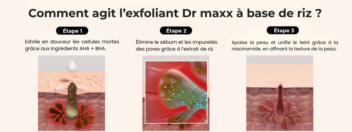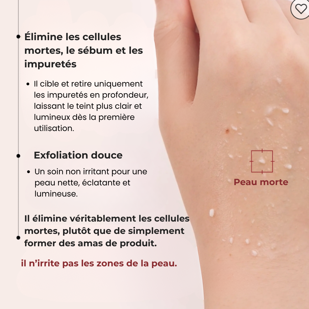 • AHA + BHA doux : éliminent les cellules mortes sans agresser la peau.